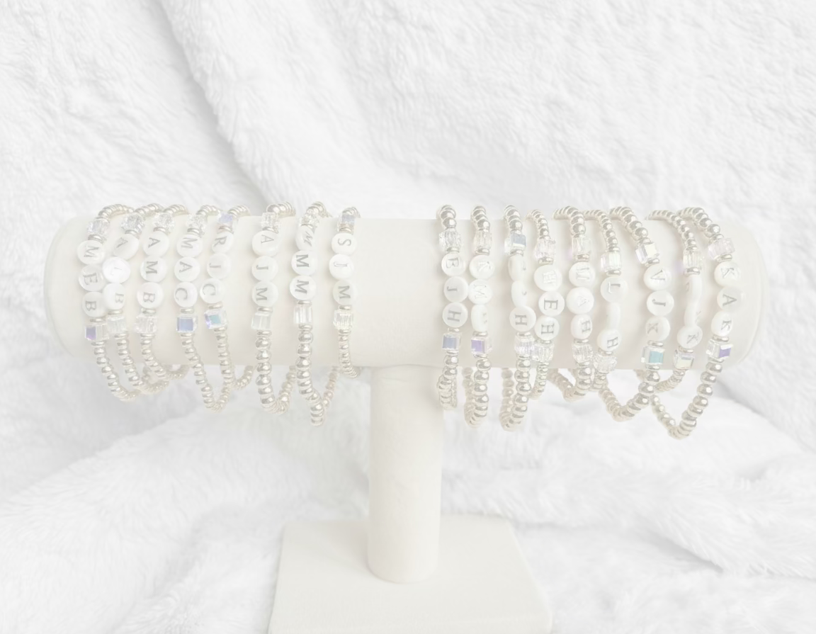 Handcrafted bracelet featuring meticulously sourced PVD-coated surgical steel beads with elegant mother-of-pearl lettering, designed for exceptional durability and a refined, long-lasting finish. Each component is rigorously tested for skin sensitivity, hypoallergenic properties, and resistance to daily wear, ensuring both comfort and longevity. A perfect blend of luxury craftsmanship and timeless sophistication, making it an ideal accessory for any occasion.